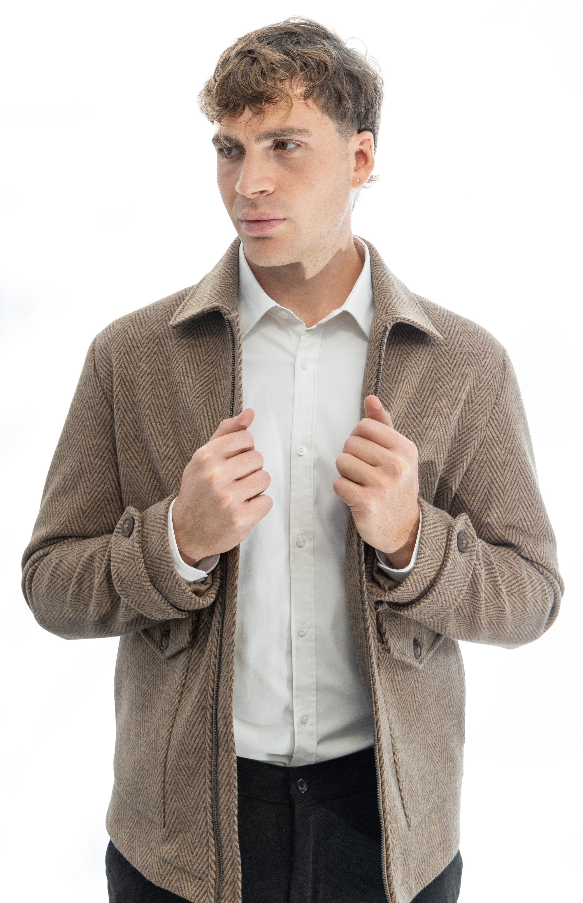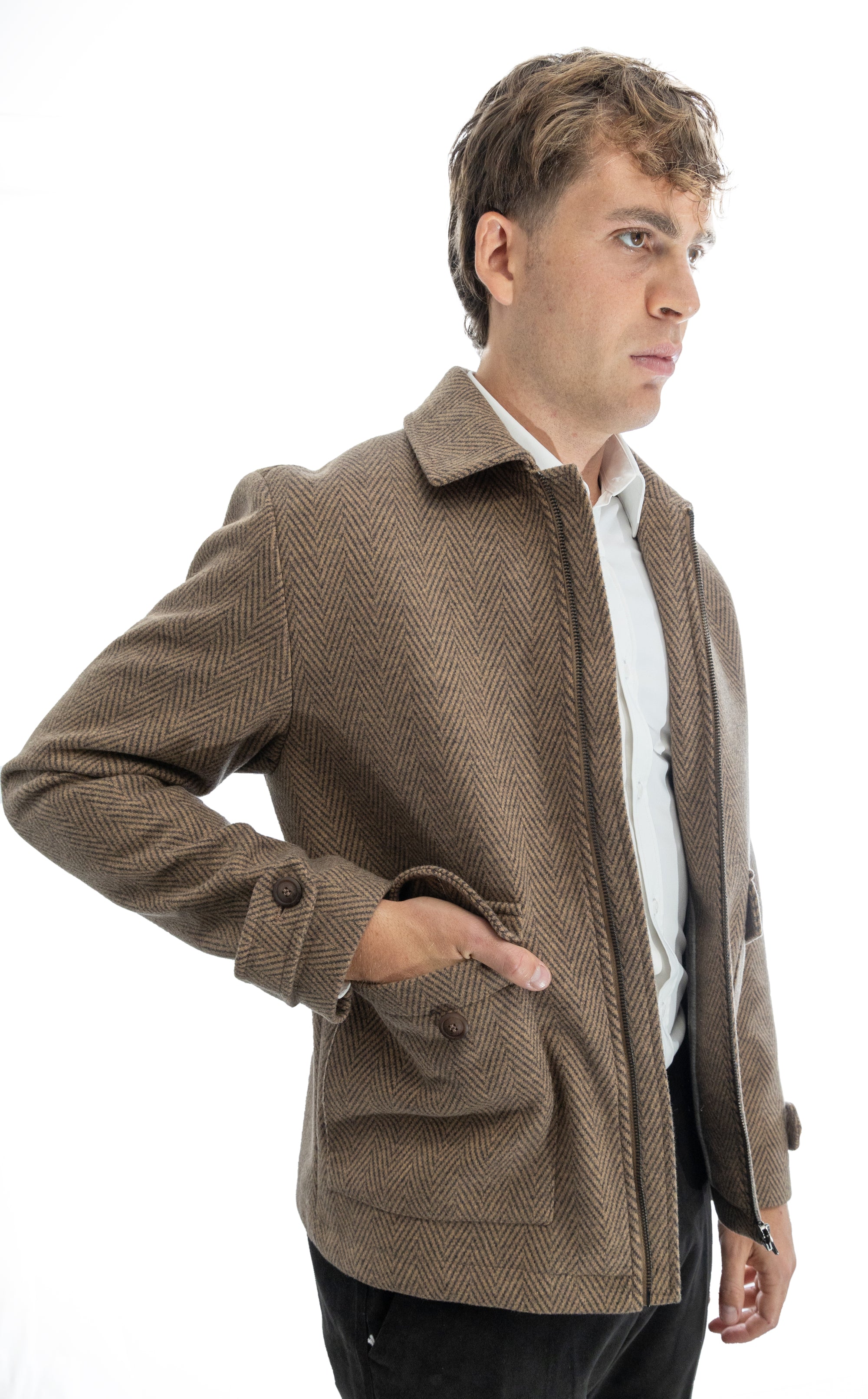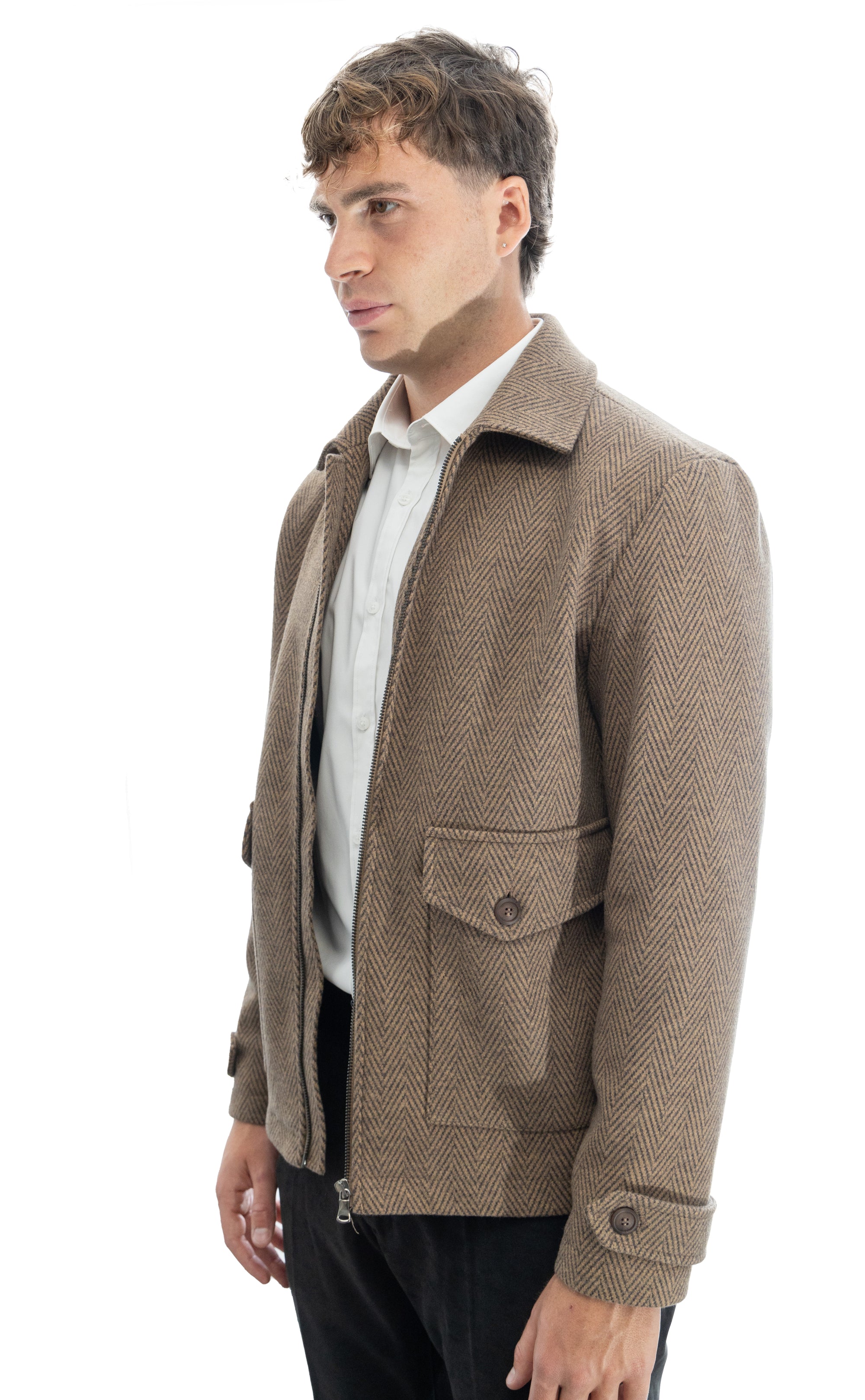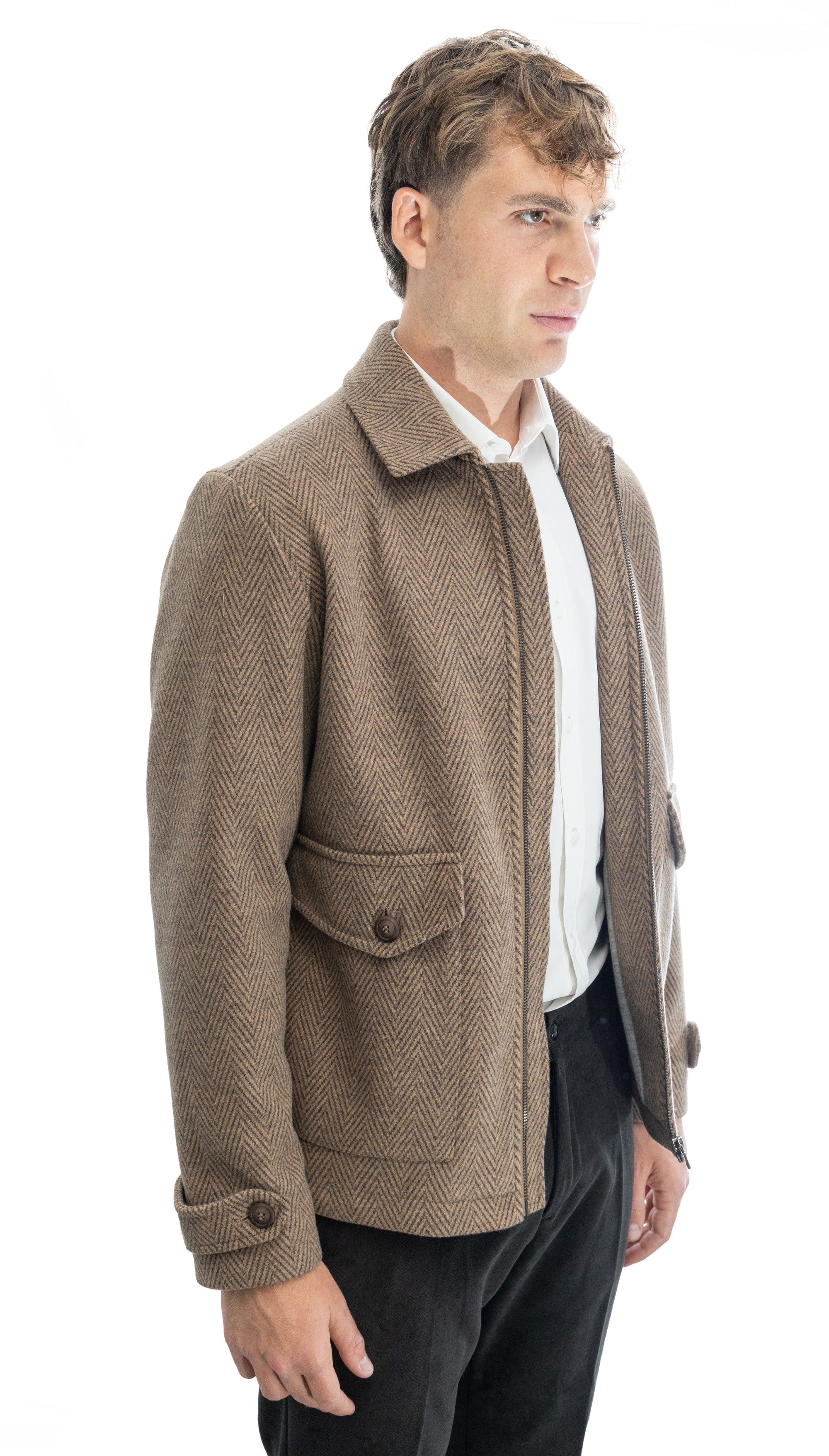 Giubbino sartoriale con collo polo e martingala alle maniche